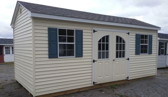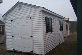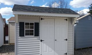 2- gable vents-6" black hinges , keyed lockset,Aluminum Face trim & bird box corner soffits, Vinyl Corners.
